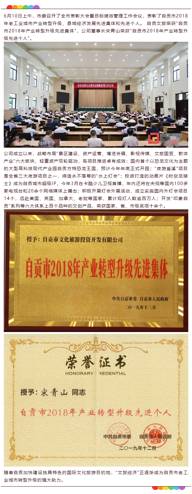 自貢文旅榮獲市2018年老工業(yè)城市產(chǎn)業(yè)轉(zhuǎn)型升級先進(jìn)集體