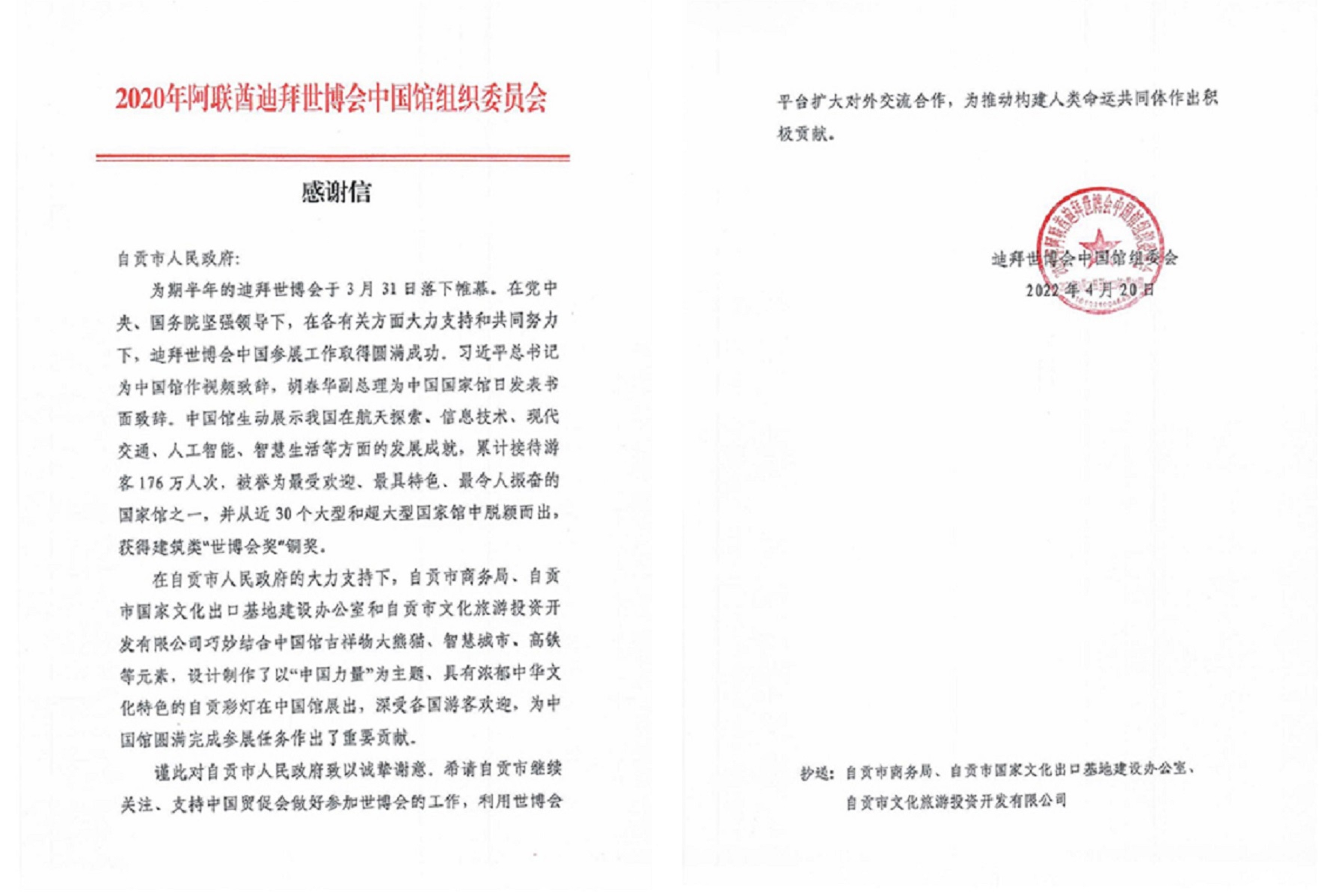 4月27日,自貢文旅投收到1封來自迪拜世博會中國館組委會的感謝信。信中對自貢市人民政府、市商務(wù)局、市國家文化出口基地建設(shè)辦公室及自貢文旅投公司在迪拜世博會中國館彩燈板塊所作出的貢獻(xiàn)表示誠摯的感謝。