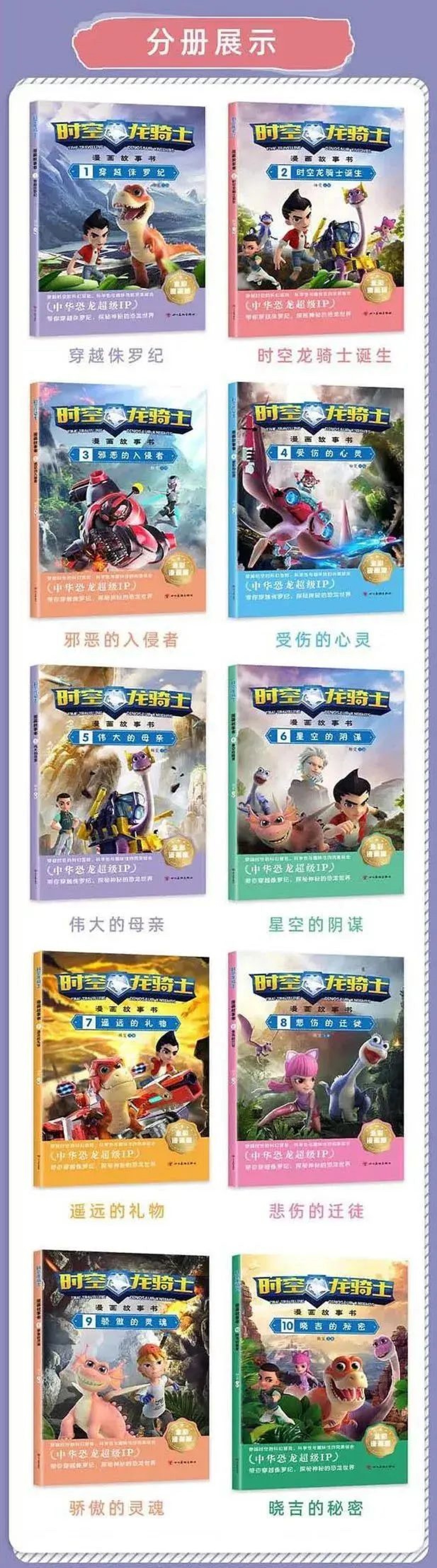《時(shí)空龍騎士》漫畫故事書有《穿越侏羅紀(jì)》《時(shí)空龍騎士誕生》《邪惡的入侵者》《受傷的心靈》《偉大的母親》《星空的陰謀》《遙遠(yuǎn)的禮物》《悲傷的遷徙》《驕傲的靈魂》《曉吉的秘密》,共10冊(cè)。