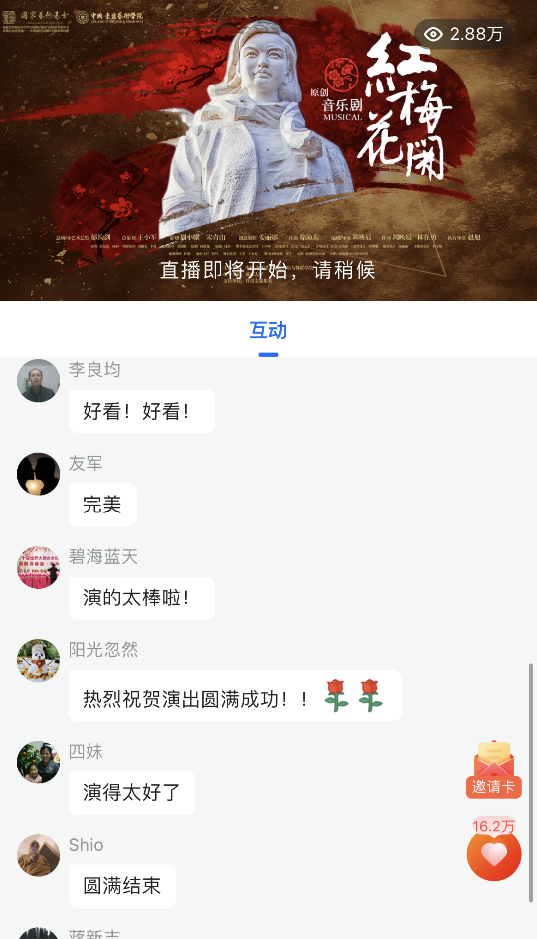 在11月7日、8日的3場演出中,累計(jì)觀看量近3萬人次,收獲16.2萬點(diǎn)贊。演出表現(xiàn)了理想與信念、崇高與悲壯、真誠與飽滿、教學(xué)藝術(shù)與舞臺(tái)張力的多元融合?!薄凹t色精神就在我們身邊,就在我們的家鄉(xiāng)?!薄斑@是年青一代汲取、反思、振奮與重塑的精神底色!”……在評(píng)論區(qū)內(nèi),5000多條情真意切的留言反映出觀眾對(duì)該劇的喜愛。