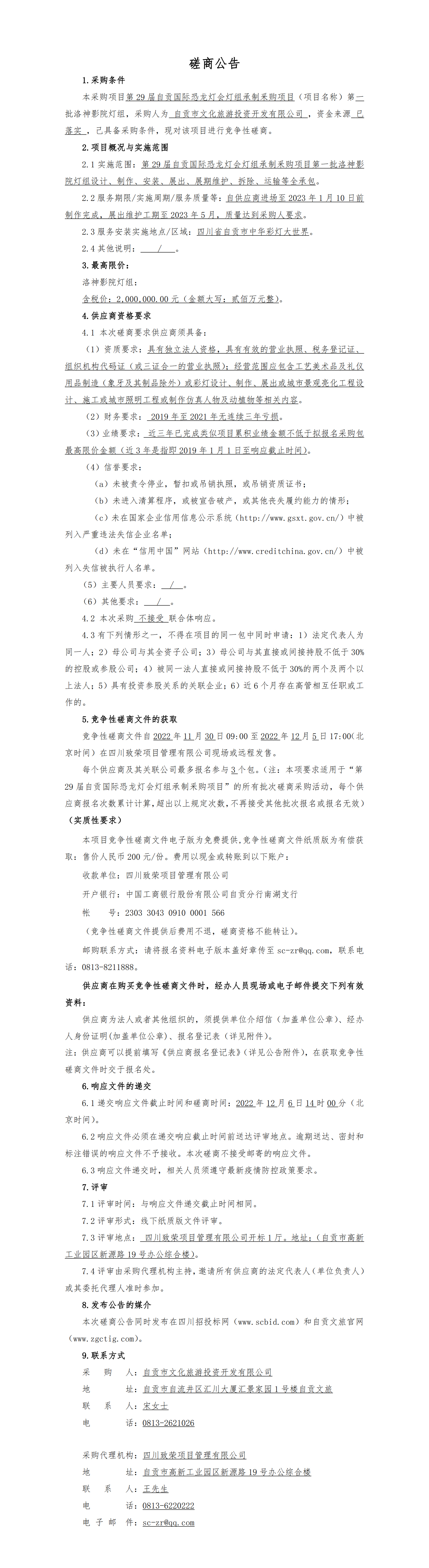 第29屆自貢國際恐龍燈會燈組承制釆購項目(項目名稱)第一批洛神影院燈組競爭性磋商采購公告