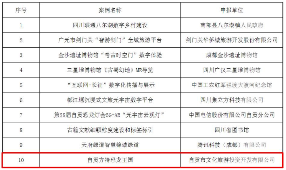 為促進(jìn)數(shù)字科技賦能文旅產(chǎn)業(yè)高質(zhì)量發(fā)展,2022年省文化和旅游廳開展了四川省文化和旅游數(shù)字化創(chuàng)新實(shí)踐案例評(píng)選工作,經(jīng)征集推薦和評(píng)審遴選,確定“自貢方特恐龍王國(guó)”等10個(gè)案例為2022年四川省文化和旅游數(shù)字化創(chuàng)新實(shí)踐優(yōu)秀案例。