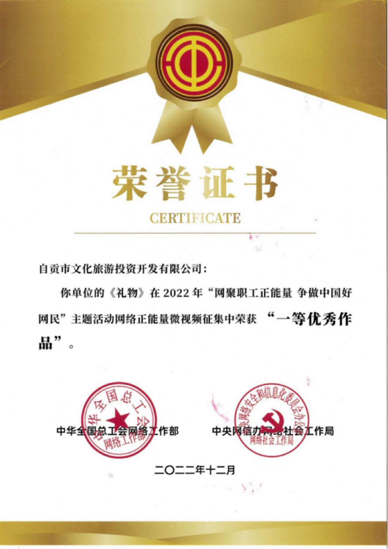 近日,自貢文旅投公司收到由全國(guó)總工會(huì)網(wǎng)絡(luò)工作部、中央網(wǎng)信辦網(wǎng)絡(luò)社會(huì)工作局聯(lián)合頒發(fā)的榮譽(yù)證書(shū),在全國(guó)總工會(huì)與中央網(wǎng)信辦主辦的2022年“網(wǎng)聚職工正能量 爭(zhēng)做中國(guó)好網(wǎng)民”主題活動(dòng)網(wǎng)絡(luò)正能量微視頻征集中,由自貢文旅投公司拍攝制作的微電影《禮物》在來(lái)自全國(guó)各地的800余部作品中脫穎而出,榮獲全國(guó)一等優(yōu)秀作品。