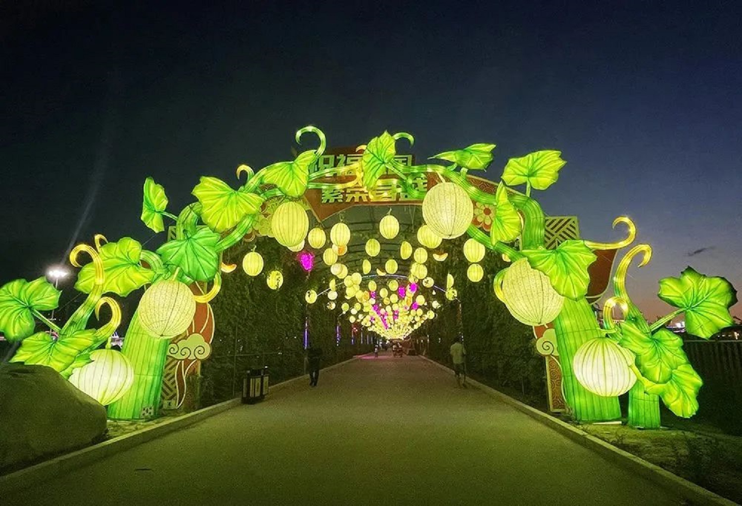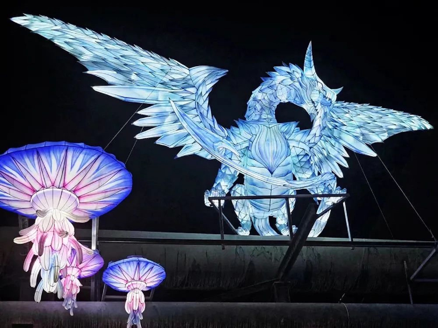 綠意盎然的“哈密瓜通道”、成群結(jié)隊(duì)的“翼龍家族”、高達(dá)6米的“恐龍戰(zhàn)士”、盤(pán)繞在鋼筋水泥之間的“機(jī)械水母”……一盞盞結(jié)合了自貢傳統(tǒng)工藝與現(xiàn)代光影技術(shù)的彩燈次第點(diǎn)亮,極具蒸汽朋克風(fēng)格的大膽設(shè)計(jì)與哈密特色文化完美融合,營(yíng)造出動(dòng)畫(huà)世界般的奇幻感受。