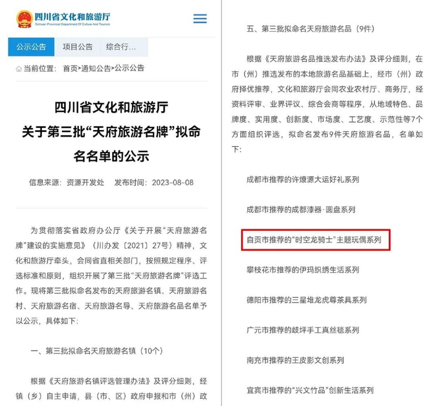 8月8日,四川省文化和旅游廳公示了第三批“天府旅游名牌”擬命名名單,名單包含擬命名的天府旅游名品、名鎮(zhèn)、名村、名宿、名導(dǎo)共5個(gè)類別。其中,由自貢文旅投公司設(shè)計(jì)制作的“時(shí)空龍騎士”主題玩偶系列入選擬命名天府旅游名品,是自貢市唯一入選該名單的系列商品。