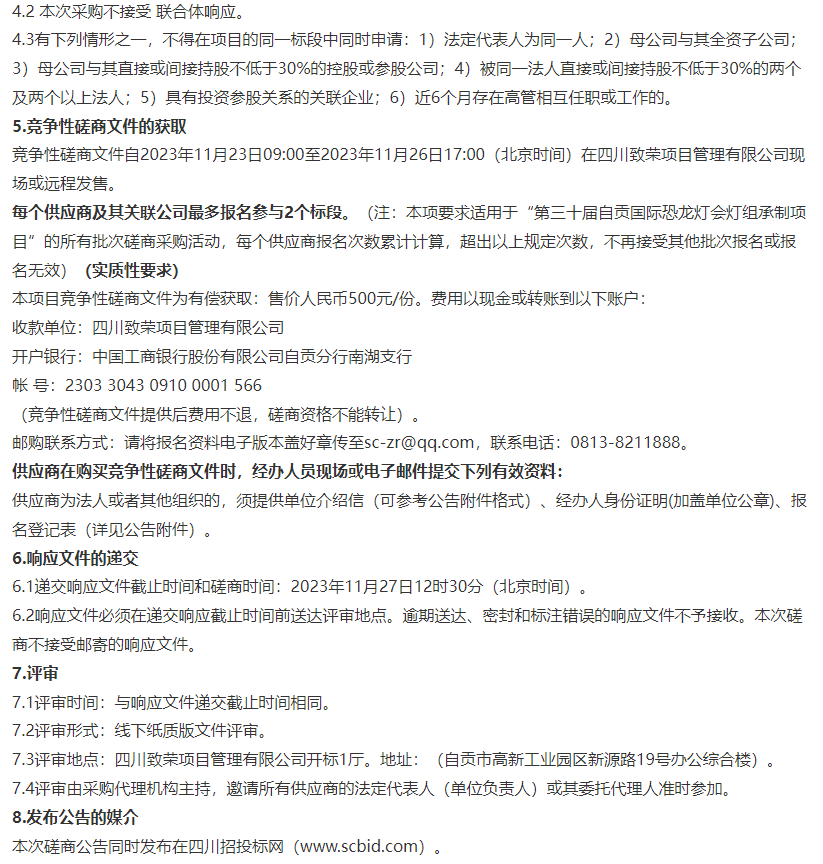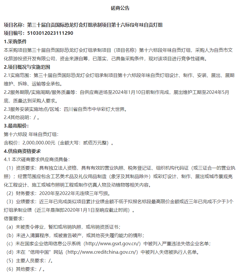 第三十屆自貢國際恐龍燈會(huì)燈組承制項(xiàng)目第十六標(biāo)段年味自貢燈組競(jìng)爭(zhēng)性磋商采購公告