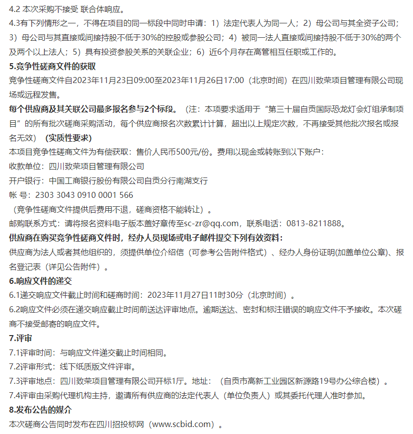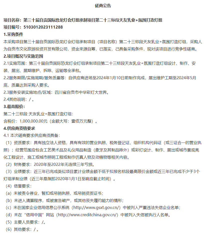 第三十屆自貢國(guó)際恐龍燈會(huì)燈組承制項(xiàng)目第二十三標(biāo)段天友乳業(yè)+氛圍打造燈組競(jìng)爭(zhēng)性磋商采購(gòu)公告
