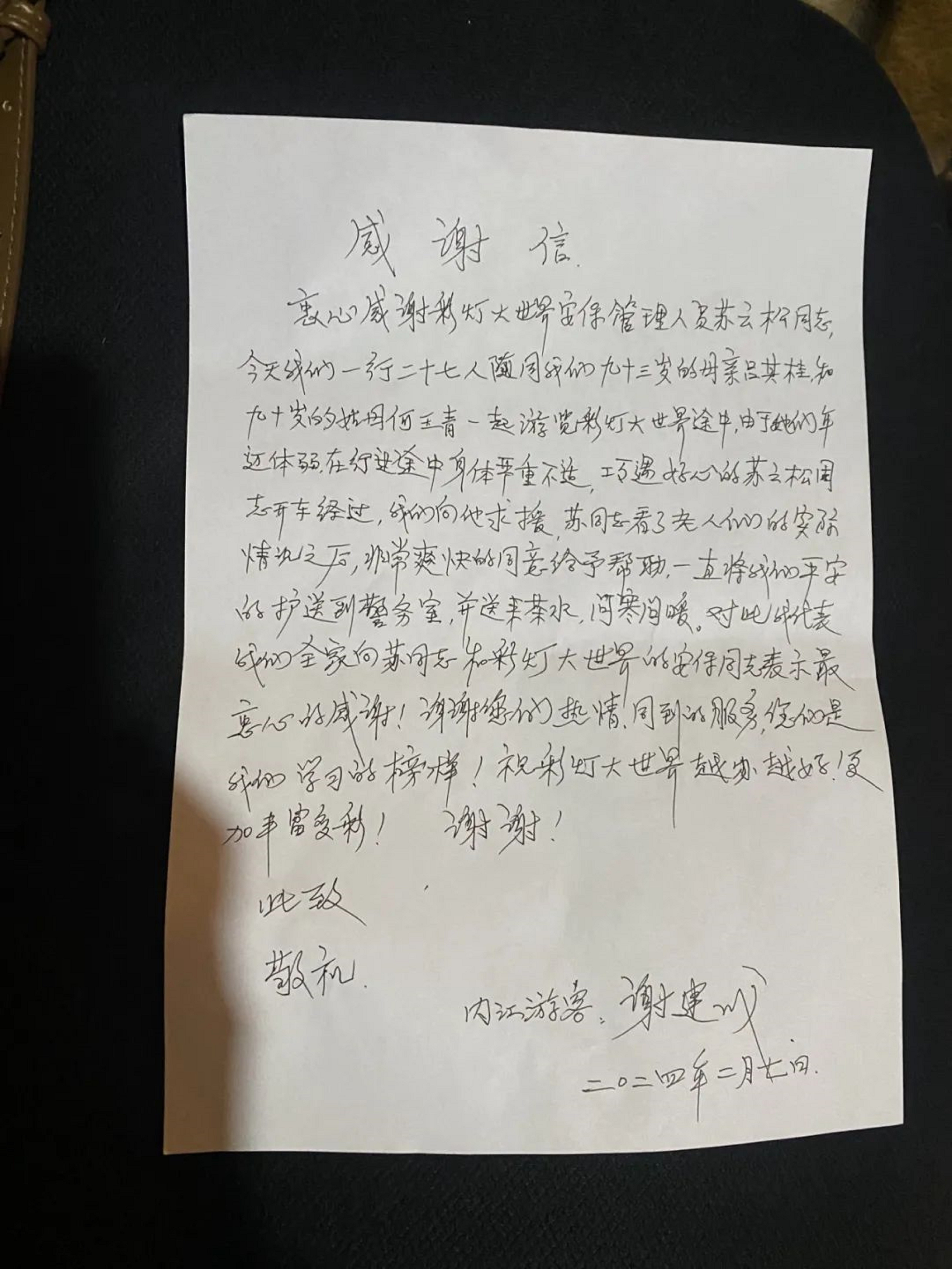 面對蘇云松的無私幫助,老人家屬感動不已。他們專門寫了一封感謝信,對蘇云松和中華彩燈大世界的全體安保人員表示衷心的感謝?!澳銈兊臒崆榉?wù)和專業(yè)精神讓我們深感溫暖,祝彩燈大世界越辦越好!”老人家屬在信中寫道。