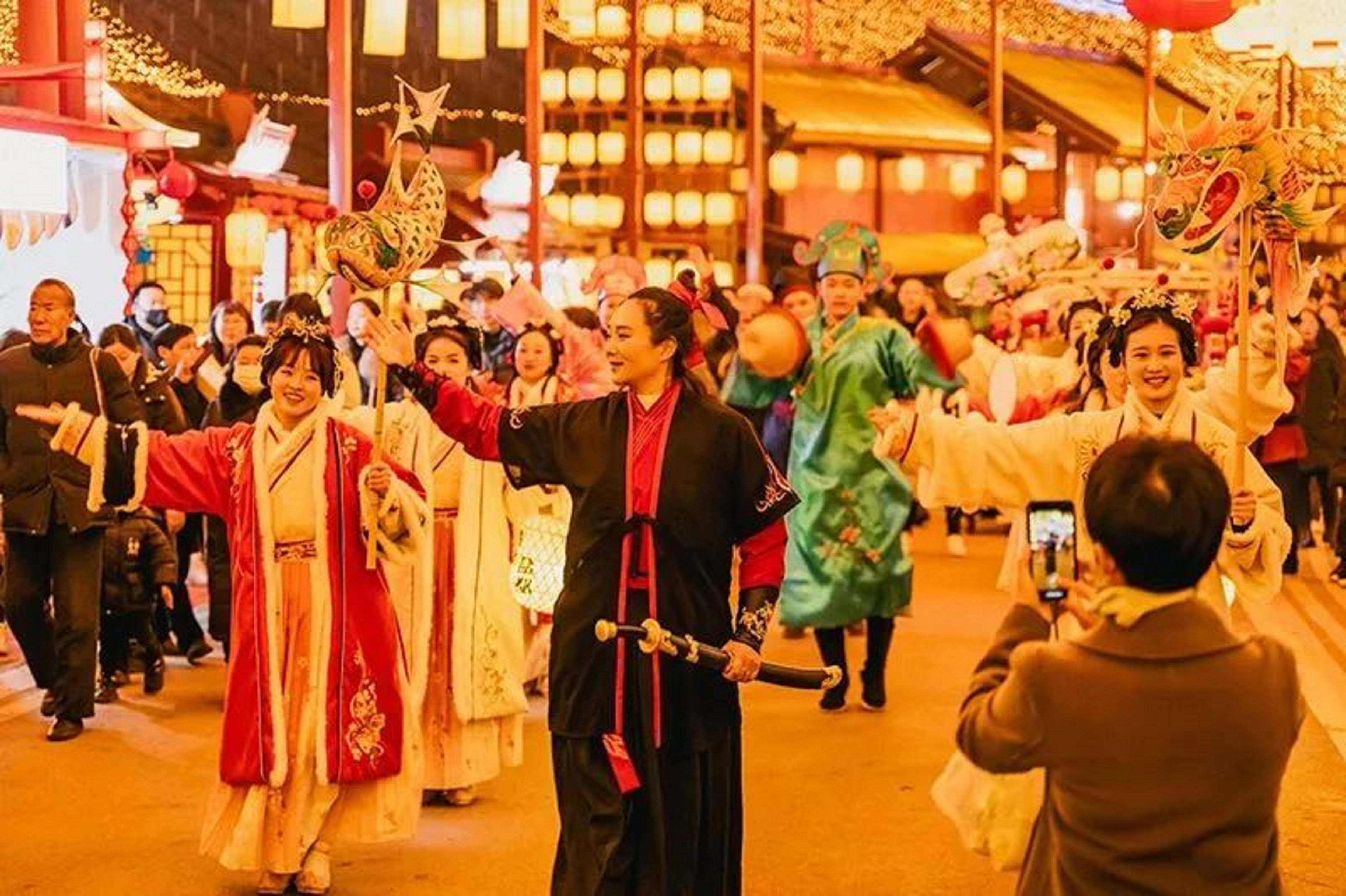 在張家沱水域,為游客帶來了非遺技藝——火龍鐵花秀,營(yíng)造“火樹銀花不夜天”的盛景;在王爺廟推出了傳統(tǒng)文藝表演,為游客帶來曲藝、川劇、雜技等專場(chǎng)演出;在毛家壩碼頭,還有漢服提燈巡游、龍鳳飛行器表演、空飄氣球模型以及光影孔雀背架表演等。多元化的民俗表演和濃濃的新年氛圍,吸引了約24萬游客前來打卡。