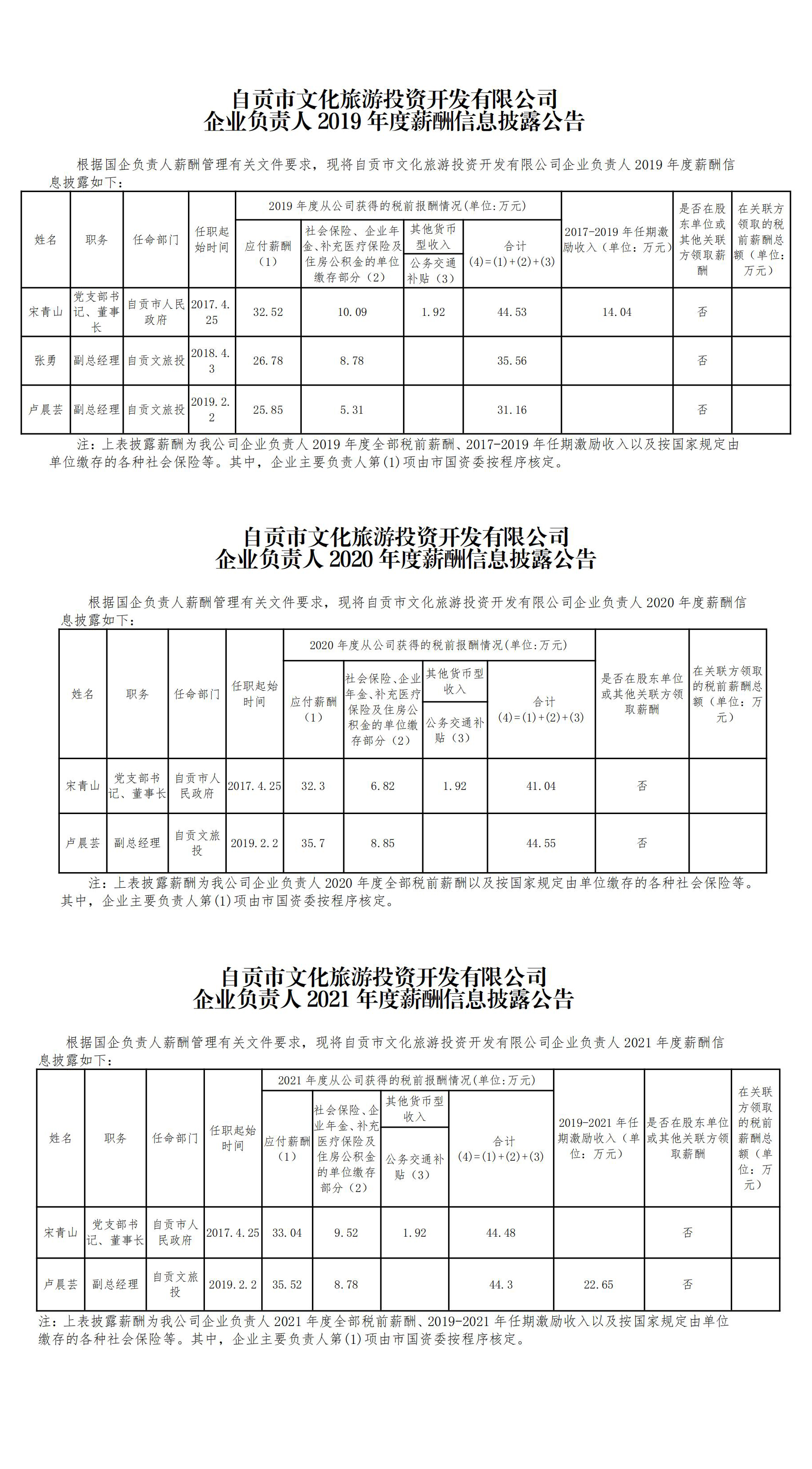 自貢市文化旅游投資開發(fā)有限公司企業(yè)負(fù)責(zé)人2019年度至2021年度薪酬信息披露公告