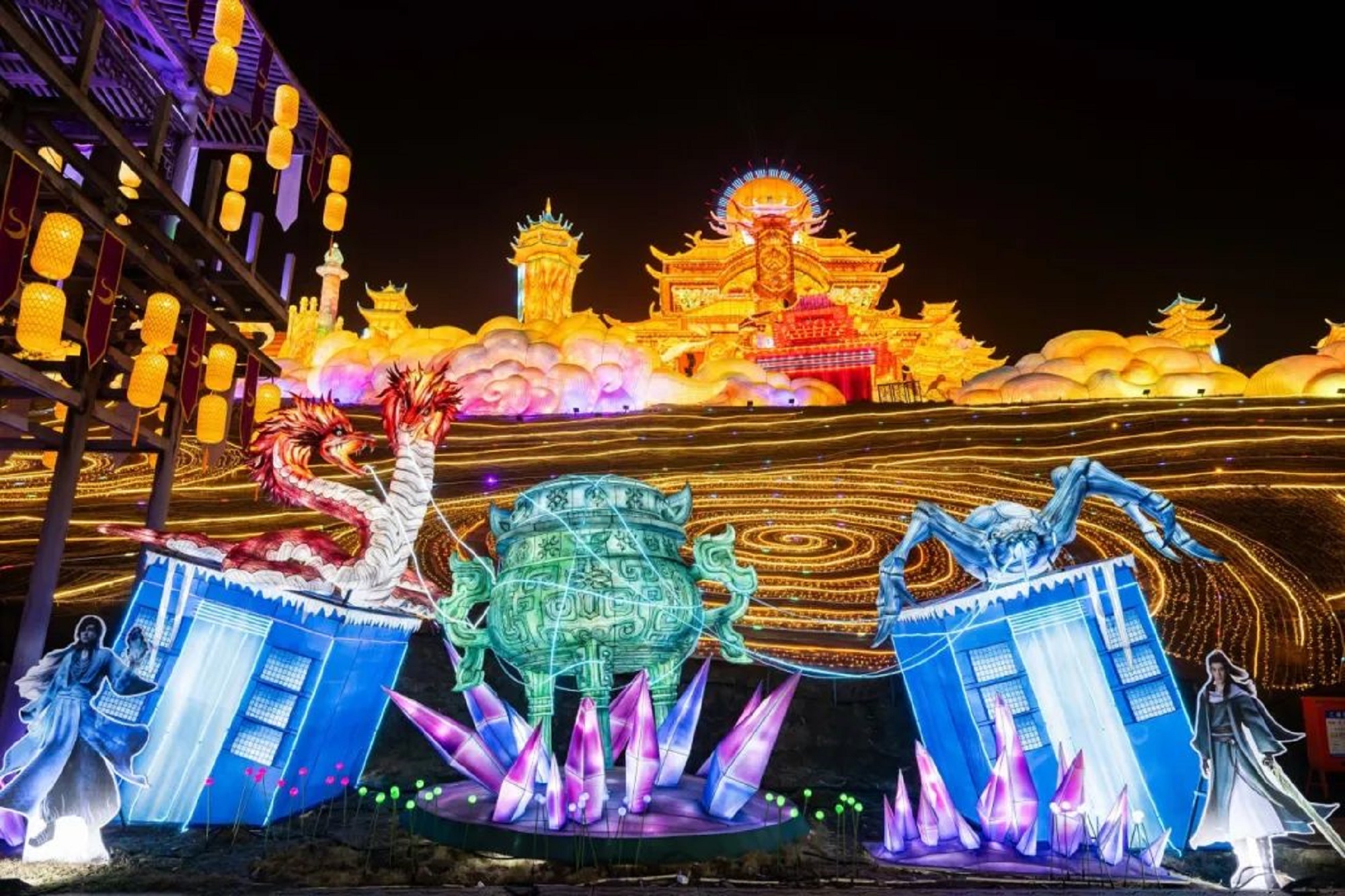 在自貢中華彩燈大世界的現(xiàn)場,《凡人不凡》燈組以其宏大的規(guī)模和精致的制作贏得了游客們的陣陣贊嘆。這條長達260米的主題燈會長街,歷經75個日夜的精心打造,不僅重現(xiàn)了動畫中的十大經典場景,如栩栩如生的“異獸拉鼎”、寓意深遠的“人生如棋”等,還展示了主角韓立的法寶“掌天瓶”“青竹蜂云劍”與“神風舟”等,讓游客們身臨其境。