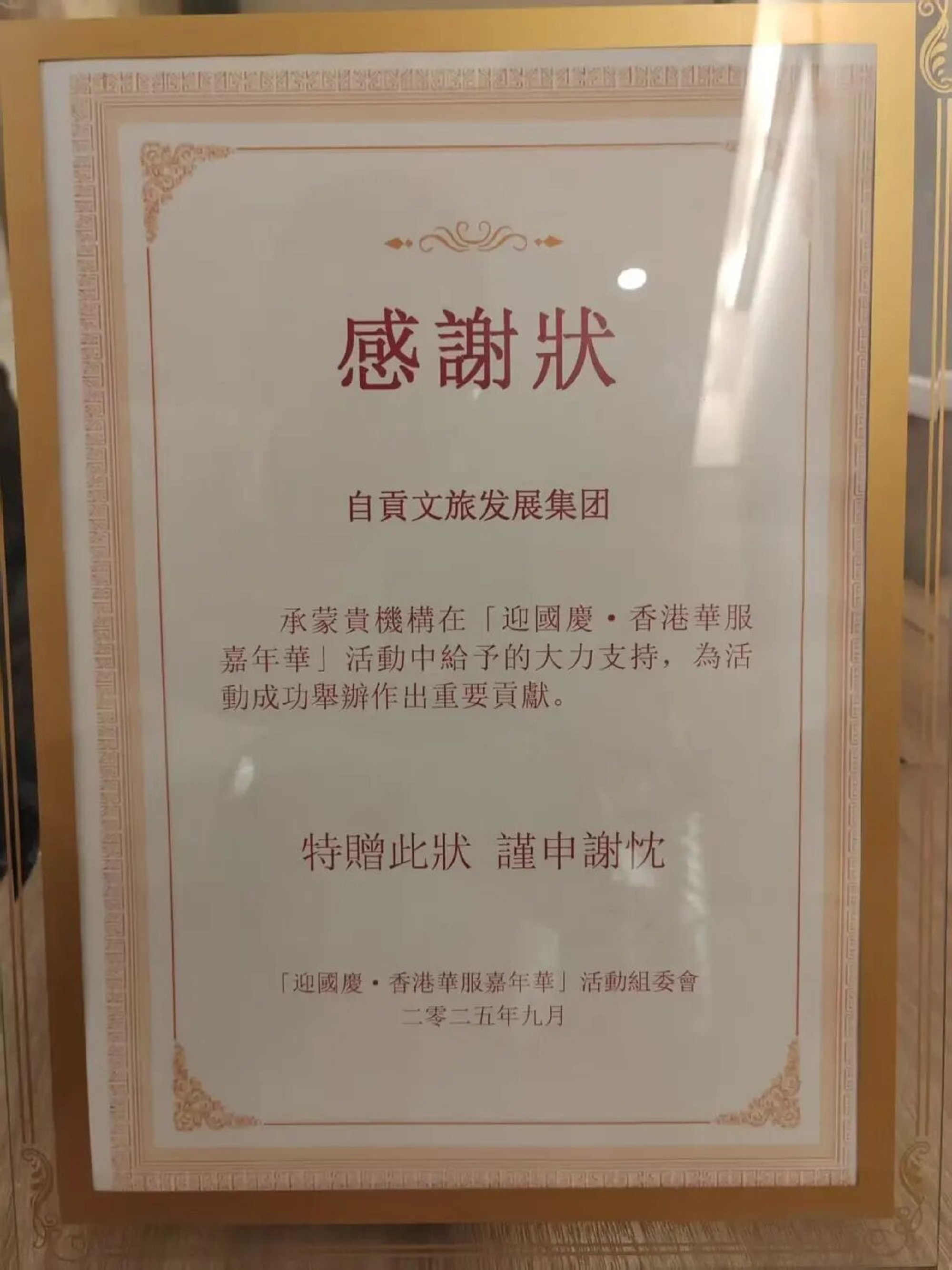 活動現(xiàn)場,霍啟剛代表組委會向自貢文旅集團(tuán)頒發(fā)感謝狀。自貢文旅集團(tuán)表示將持續(xù)發(fā)力——自貢彩燈承載千年文化底蘊(yùn),凝聚無數(shù)工匠心血,既是藝術(shù)瑰寶,也是文化交流使者。此次華服彩燈嘉年華,愿為廣大香港市民呈現(xiàn)最優(yōu)的中華彩燈作品,傳遞中華優(yōu)秀傳統(tǒng)文化魅力!