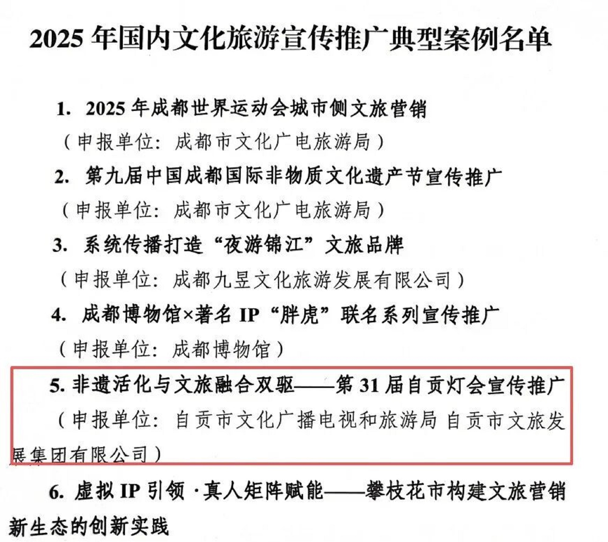 近日,在文化和旅游廳組織開展的2025年國(guó)內(nèi)文化旅游宣傳推廣典型案例評(píng)選活動(dòng)中,由自貢市文化廣播電視和旅游局、自貢市文旅發(fā)展集團(tuán)有限公司選送的“非遺活化與文旅融合雙驅(qū)——第31屆自貢燈會(huì)宣傳推廣”宣傳推廣案例,成功被列入2025年國(guó)內(nèi)文化旅游宣傳推廣典型案例名單。