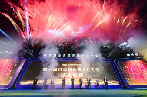 21日晚,第三屆自貢國際恐龍燈光節(jié)在自貢釜溪文創(chuàng)公園盛大開啟,絢爛的燈光秀與綻放的美麗煙花再次點亮了燈城的夜空。